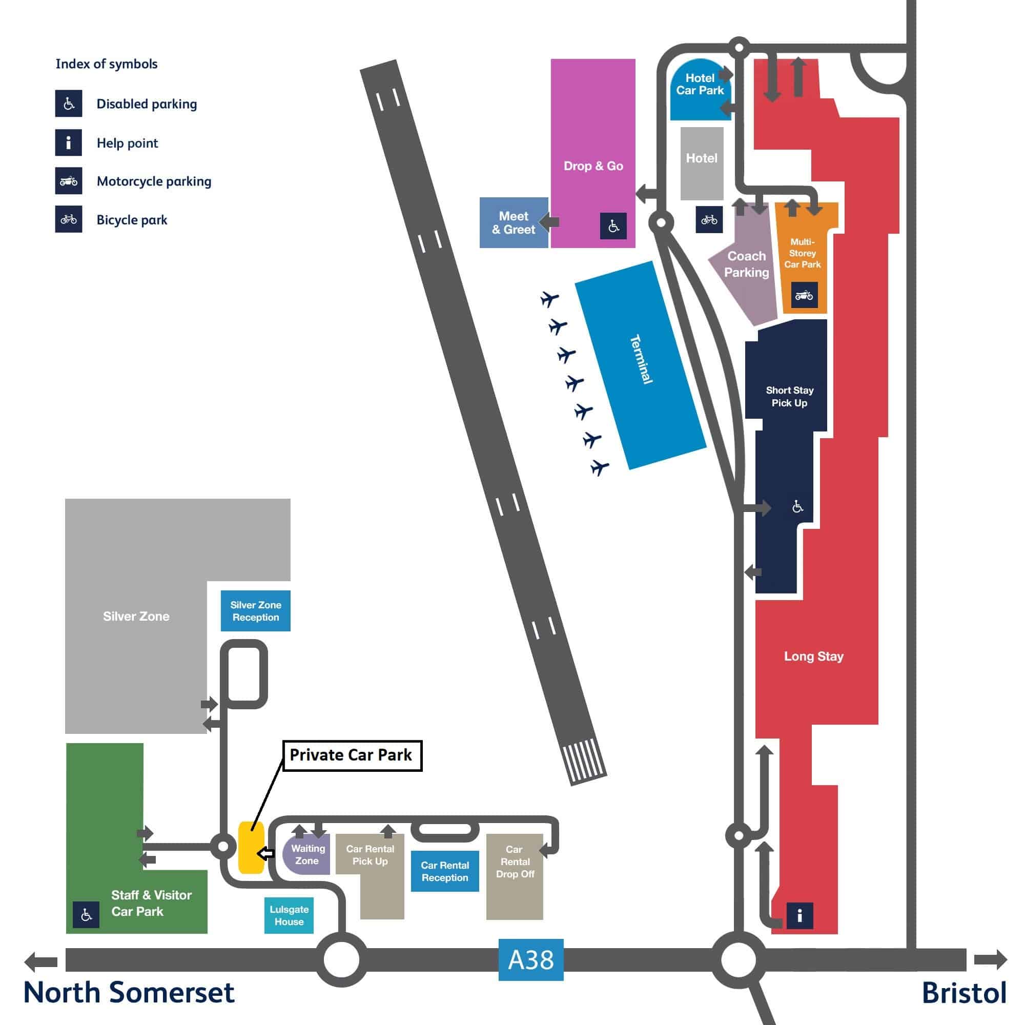 The admin building (noted on the map as Lulsgate House) is located on the south side of the airport, exit the Silver Zone roundabout and the building is on your left.